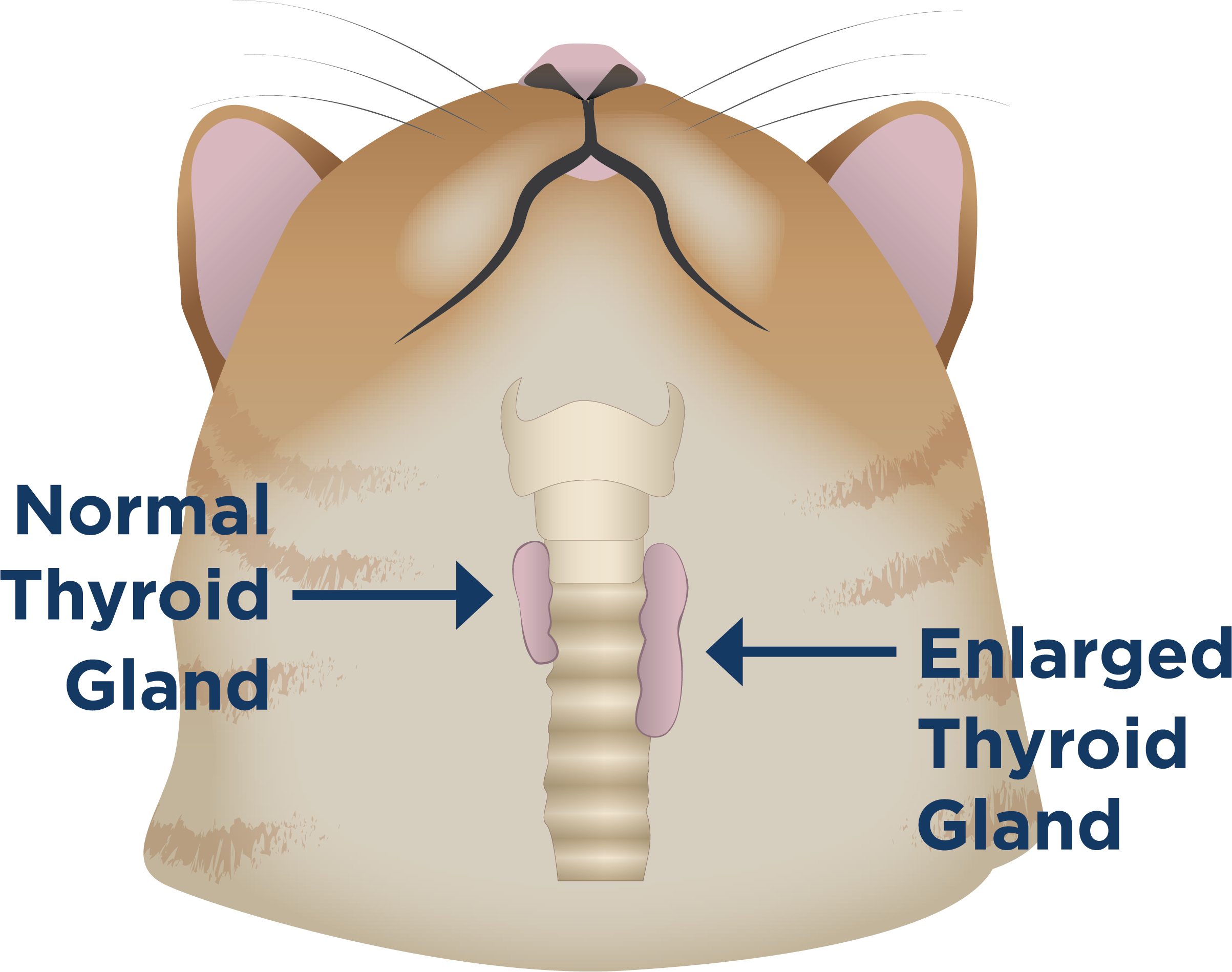 The paired thyroid glands in your cat’s neck use iodine to produce thyroid hormone (T4) which controls their metabolic rate. Hyperthyroidism results when a tumour in the thyroid tissue produces excessive amounts of thyroid hormone, causing damage to and dysfunction of many body systems. As the tumour grows, the production of thyroid hormone increases, escalating the severity of the disease over time